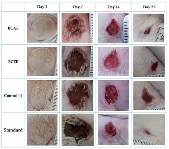 Wound induction was performed by burning the dorsal area, using the methods described in previous work [] with slight modifications. Twenty Wistar rats divided into four groups were used: a negative control group (Vaseline® treatment), a second group treated with a healing ointment (Madecassol® at 1%), a third group and a fourth group treated with the BCAE and BCEE ointments, respectively. An electric tensioner was used to shave the dorsal area of the rats, then an intraperitoneal anesthesia (pentobarbital at 50 mg/kg) was conducted before the induction of the burn (placement of a 1.7 cm diameter aluminum rod heated in boiling water on the burn induction area for 10 s). The treatment over the three weeks was performed by the daily covering of the burned dorsal surfaces with the prepared ointments. Photographs were taken of the wound surfaces using a digital camera with the presence of a graduated ruler. The images obtained were analyzed using ImageJ software in order to measure contraction rate of the wound surfaces (Equation (2)).