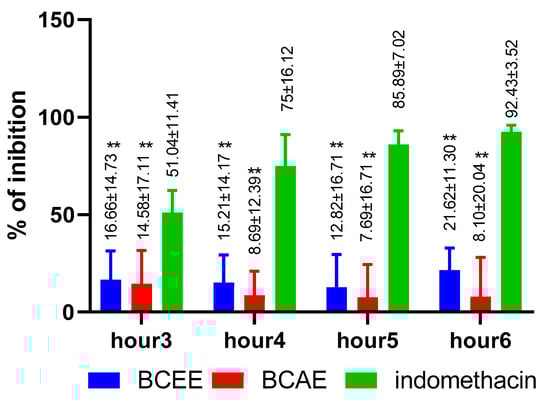 The anti-inflammatory efficacy and potency of the studied extracts was less than that of the positive control of Indomethacin (Figure 7). Despite its richness in different phenolic types, BCAE has minimal anti-inflammatory efficacy with the greatest % inhibition of 8.1% observed during the sixth hour. BCEE exhibited greater anti-inflammatory efficacy than BCAE. The percentage of inhibition obtained using BCEE varies between 12.82% and 21.62% during the 3 h of measurement (p value < 0.01).