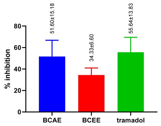 BCAE exerts remarkable analgesic activity with a percentage of inhibition of 51.60 ± 15.18%, while BCEE exerts weak activity with a percent of inhibition of 34.33 ± 6.60%. BCEE also shows low analgesic activity compared to Tramadol (55.64 ± 13.83%) with a significant difference (Figure 8). BCAE exhibited analgesic activity, similar to that of Tramadol with no significant difference.