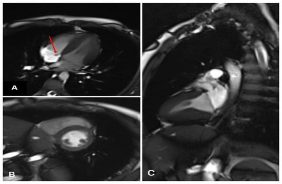 Heart MRI with contrast. (A) Four-chamber plane (formation of a septal valve—red arrow). (B) Two-chamber plane along the short axis (normal). (C) Two-chamber plane along the long axis (norm).