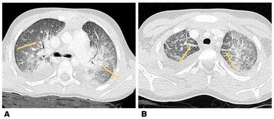 According to the laboratory data, we found thrombocytopenia up to 107 × 109/L, a significant increase in the level of C-reactive protein (CRP) up to 122.6 mg/L and procalcitonin up to 33 ng/mL (normal up to 2), ferritin up to 377 mcg/L (normal up to 140), fibrinogen up to 5.04 g/L, D-dimer up to 3.24 µg/L (normal up to 0.56), and hypoalbuminemia up to 20 g/L.