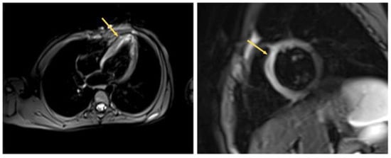 Signs of the signal enhancement on Tirm due to edema of the IVS myocardium were revealed on the heart MRI data with contrast, which indicated inflammatory changes in the myocardium three weeks later (Figure 5 and Figure 6).