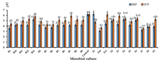 pH of microbial-inoculated ERP and TCP culture broths after incubation for 5–7 days at 100 rpm at 32 °C. Mean values that do not share the same letter are significantly different at p < 0.05.