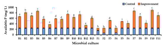Available P concentration improvement in the TCP-enriched PK broths which were inoculated with PSM cultures (B1–F11) when compared to the available P concentration in the control broth. Mean values that do not share the same letter are significantly different (p < 0.05).