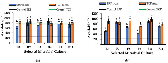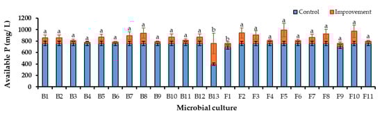 Available P concentration improvement in ERP-enriched PK broths which were inoculated with PSM cultures (B1–F11) when compared to the available P concentration in control broth. Mean values that do not share a same letter are significantly different (p < 0.05).