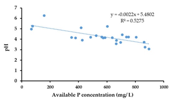 A negative correlation was observed between pH and the available P concentration in the PK broths (Figure 7). This finding suggested that P solubilization could be expedited by acidification of the medium. A similar negative correlation between pH and the available P content was reported earlier by Illmer and Schinner [42] and Hwangbo [43]. This correlation was also observed in the pot trial between pH and the available P concentration of soil in each treatment.