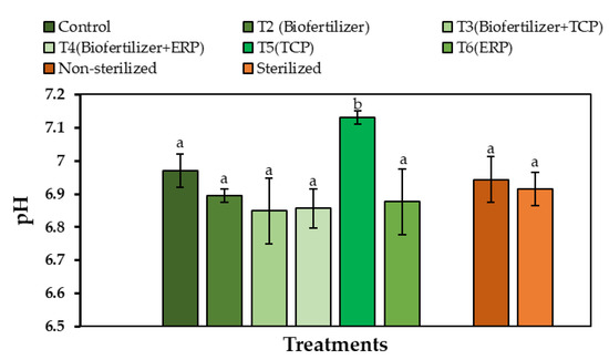 Mean values of pH of treatments. Mean values that do not share the same letter are significantly different (p < 0.05).