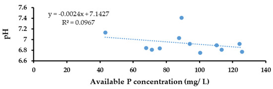 The results of the Pearson correlation indicated that there was a non-significant, very small, negative relationship between available P concentration (mg/L) and pH (r (10) = 0.311, p = 0.325) (Figure 9).