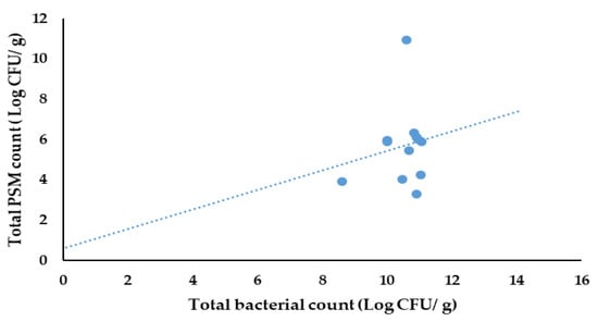 The results of the Pearson correlation indicated that there was a non-significant, small, positive relationship between the total bacterial count and the PSM count (r (10) = 0.173, p = 0.591) (Figure 11).