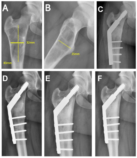 (A,B) Preoperative radiograph, anteroposterior, and lateral views. Volume measurement in a unicameral bone cyst of the proximal femur. Application of the volume formula ABC × 0.785 = 52.25 cm3 (cylindrical defect). (C) Immediate postoperative radiograph after curettage, grafting, and plate fixation. Bone graft homogeneously distributed in the cavity with >90% filling. (D) Postoperative 6-month follow-up radiograph showing cortical thickening and partial graft incorporation. (E,F) Radiographs at 12- and 24-month follow-up, showing complete graft incorporation (Neer I) and bone remodeling.