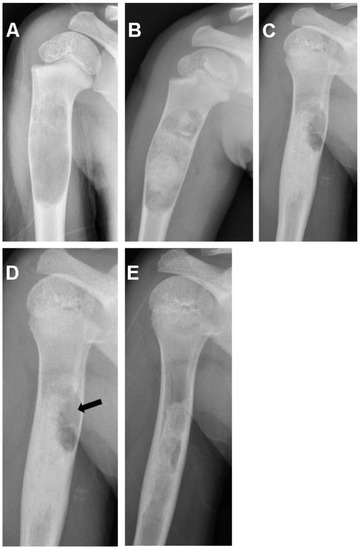 (A) Preoperative radiograph of a unicameral bone cyst of the humerus. (B) Immediate postoperative radiograph after curettage and bone graft filling <90% of the cavity. (C,D) Postoperative 6- and 12-month follow-up radiographs showing radiolucent area <50% (arrow) of the bone diameter (Neer II). (E) Twenty-four-month follow-up radiograph showing cortical thickening, bone remodeling, and small intramedullary cystic remnants.