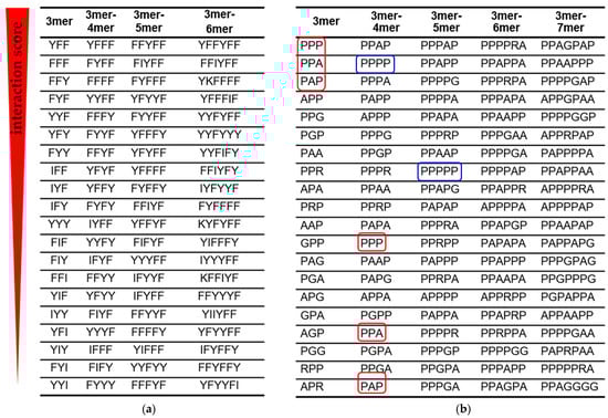 Amino acid signatures of RNA–peptide interactions. Peptide fragments with the highest interaction score are arranged in descending order (top to bottom). (a) Peptide fragments from the AU peptide library when interacting with 12-mer adenine RNA. (b) Peptide fragments from the GC peptide library when interacting with 12-mer cytosine RNA. Shorter fragments (red frames) are displaced by longer fragments from the list of signatures with the highest interaction score. The blue frames show the displacement of polyprolines from the position of the strongest binders to 12-mer cytosine RNA as the fragment length increases.