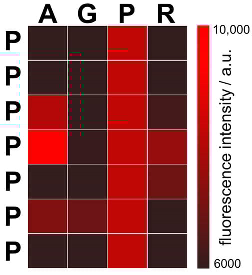 Fluorescent signals from the peptides after substitutions of 7-mer polyproline PPPPPPP. Each position in the polyproline was substituted with amino acids Ala (A), Gly (G), or Arg (R) from the dominant GC-protocode. For example, the upper left square represents the peptide APPPPPP, and the bottom right square the peptide PPPPPPR. All modified peptides were incubated with the 12-mer cytosine RNA. The peptide PPPAPPP (4th position in the first column with the highest fluorescence intensity) binds the 12-mer cytosine RNA most strongly.