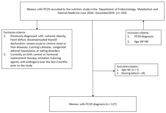 A total of 127 women of reproductive age diagnosed with PCOS were recruited from the Department of Endocrinology, Metabolism and Internal Medicine, Poznan University of Medical Sciences (Figure 1). Participants were classified according to Rotterdam criteria. Specific inclusion criteria for the study group were as follows: PCOS diagnosis (according to Rotterdam criteria), age 18–40, and BMI 18–35 kg/m2. Exclusion criteria for both low and medium-high AIP groups comprised: chronic hepatic, renal or rheumatic diseases; overt hypothyroidism; and pregnancy. Written informed consent was obtained from all participants. The clinical examination protocol complied with the Declaration of Helsinki for Human and Animal Rights and its later amendments and received ethical approval from the Board of Bioethics of the University of Medical Science (552/16; 986/17).