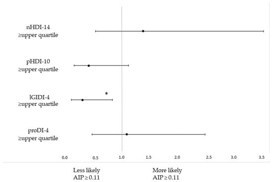Odds ratios with 95% confidence intervals for upper quartiles of diet quality indexes when the atherogenic index of plasma (AIP) was above or equal to 0.11, adjusted for age and BMI. p values below the statistical significance threshold are marked with * (p < 0.05).