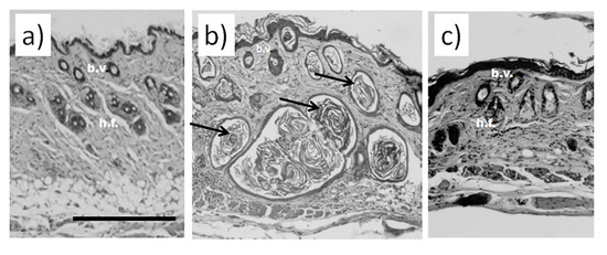 Histological analysis of murine skin. (a) Skin of an animal injected with saline without visible damage; (b) murine skin after injections with bleomycin; (c) murine skin after the course of bleomycin and subsequent laser therapy. Scale bar is 100 μm. Bundles of collagen fibers in bleomycin-treated mice are indicated by black arrows b.v.—blood vessels; h.f.—hair follicles.