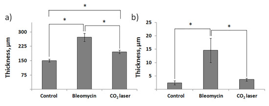 The thickness of murine skin before and after injections with bleomycin and the following laser therapy. (a) The total thickness of the skin; (b) thickness of the epidermis. “Control”—mice injected with saline; “Bleomycin”—mice injected with bleomycin; “CO2 laser”—mice injected with bleomycin after irradiation with a CO2 laser. Statistically significant differences of the means in groups less than 0.05 are indicated by asterisks (*).