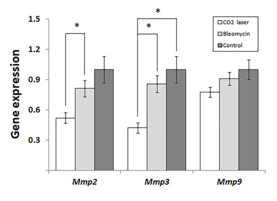 Changes in the expression of matrix metalloproteinases in mice injected with saline and bleomycin-injected mice before and after the laser therapy. “Control”—mice injected with saline (group 1); “Bleomycin”—mice injected with bleomycin (group 2); “CO2 laser”—mice injected with bleomycin after the laser therapy. Statistically significant differences of the means in groups less than 0.05 are indicated by asterisks (*).