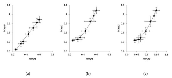 Exploring the correlations of the expression levels, we found that the expression of MMPs in bleomycin-injected mice is well-coordinated. The levels of Mmp2, Mmp3, and Mmp9 were strongly correlated. We also noticed that changes in the expression level of Mmp3 were proportional to those of Mmp9, and the corresponding data points could be fit with a linear regression (Figure 4a). Contrarily, the correlation between Mmp2 and either Mmp3 or Mmp9 was non-linear and could be better approximated with a polynomial regression (Figure 4b and c, respectively). Non-linear correlations in gene expression of Mmp2 and two other MMPs may suggest that the biosynthesis of Mmp2 mRNA can be controlled by an enhancer.