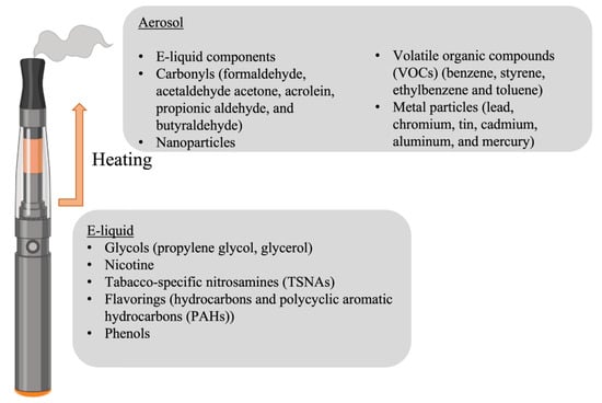 There are as many compositions of e-cigarettes as there are models available on the market. The main components that are consistently found, in varying concentrations, in e-liquid are water, glycols, and nicotine (Figure 2). Comprehensive analyses of e-liquid and aerosol detected more than 80 compounds [10], amongst them: