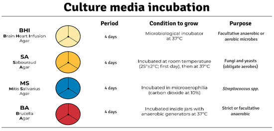 The following supporting information can be downloaded at: https://www.mdpi.com/article/10.3390/life13030831/s1. Table S1: Median (minimum–maximum) CFU/mL values, considering culture media, sample type, and collection time.