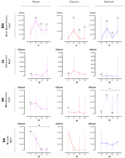 The CFU/mL results for each culture medium for samples collected at each ZT are expressed as their respective medians (see Figure 2 or Table S1).