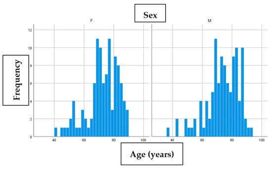 Our study included a total of 180 patients with a total of 211 basal cell carcinomas operated (155 patients had 1 BCC, 22 patients had 2 BCC, 2 patients had 3 BCC and 1 patient had 5 BCC). The sex distribution in our group was 88 women (48.9%) and 92 men (51.1%). The median age of the women’s group was 73 years, while for men the median was 73.5 years. Age/sex distribution is represented in the following histogram (Figure 1).
