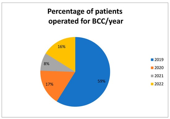 Between January 2019 and August 2022, there were 180 patients operated for BCC in our hospital. Figure 2 shows the percentage of patients operated each year.