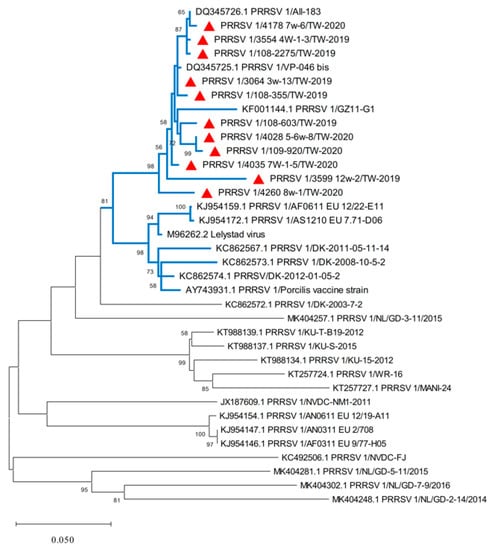 A phylogenetic tree based on the ORF5 gene of PRRSV 1 sequences was constructed by maximum likelihood estimation (MLE) using the Kimura 2-parameter (K2P) mode under the gamma distribution with 1000 bootstrapping replicates. Horizontal branch lengths indicate genetic distances among different viral strains. The red triangle represents the Taiwan PRRSV 1 strains isolated in 2019–2020 within the blue cluster. The scale bar indicates nucleotide substitutions per site.