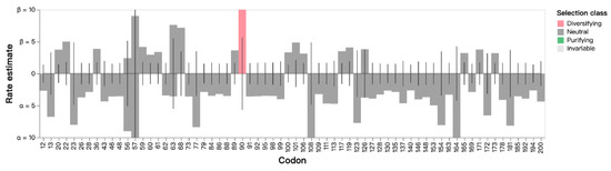 To precisely deduce the positive/diversifying and negative/purifying selection sites, four algorithms, Fixed Effects Likelihood (FEL), Single-Likelihood Ancestor Counting (SLAC), Fast Unconstrained Bayesian AppRoximation (FUBAR) and Mixed Effects Model of Evolution (MEME), were performed. The ratio of non-synonymous substitutions (beta) and synonymous substitutions (alpha) per site based on the maximum likelihood tree was calculated using the FEL, SLAC and MEME methods at a significance level of 0.05 [24], while the posterior probability of positive or negative selection at a single site was evaluated using the FUBAR method with a threshold set at 0.95 [25]. All of the abovementioned methods were implemented on the Datamonkey web server of the HyPhy software package (http://www.datamonkey.org (accessed on 14 February 2022)) [26].