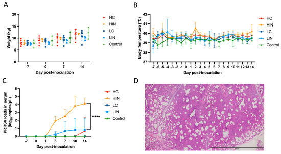 The variations of both body weights and body temperatures in each group are recorded in Figure 4A,B. No statistically significant difference in weekly body weights and daily body temperatures was observed among different groups. During this study, no sign of fever was discovered in a single pig. Regarding the PRRSV antibodies, all pigs in the HIN group and 1 pig in the LIN group showed positive after 3 DPI. The levels of PRRSV 1 viral loads in each group were depicted in Figure 4C. In the HIN group, the average viral titers in serum were 1.94 ± 0.45 log10 copies/µL at 3 DPI, and gradually climbing at 7, 10 and 14 DPI with viral titers of 2.51 ± 0.72, 3.80 ± 1.01 and 4.10 ± 0.58 log10 copies/µL, respectively. As to the LIN group, only 1 pig showed positive viral titers starting from 0.24 ± 0.34 log10 copies/µL at 3 DPI, 0.67 ± 0.94 log10 copies/µL at 7DPI, to a viral peak of 0.81 ± 1.14 log10 copies/µL at 10 DPI and finally 0.81 ± 1.14 log10 copies/µL at 14 DPI. In the HC group, the viral titer of 0.80 ± 1.13 log10 copies/µL was discovered at 14 DPI. Significantly statistical differences (p < 0.001) were noticed at 14 DPI. Moreover, the histopathological examination manifested that the PRRSV-associated lesions of severe interstitial pneumonia were only noted in pigs at the HIN group (Figure 4D).