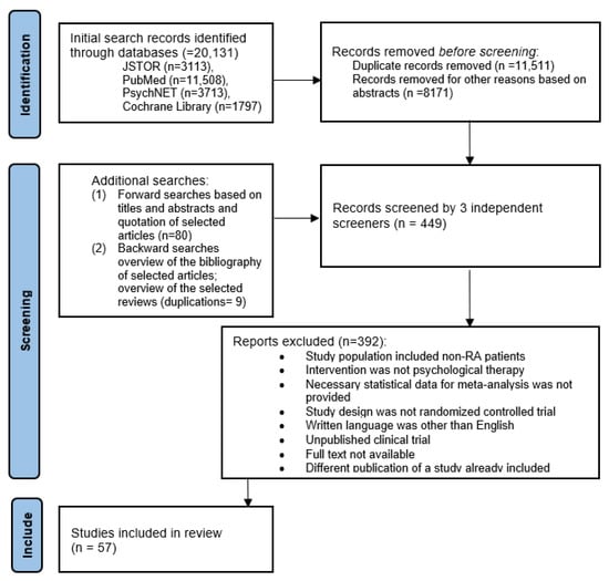This review was conducted based on the Cochrane Handbook for Systematic Reviews of Interventions [53]. First, both the inclusion and exclusion criteria were specified. The following eligibility criteria were applied based on the following PICOS components: (1) population: RA; (2) intervention: all types of psychological interventions; (3) comparison: control group; (4) outcome: quantitative results necessary for meta-analysis; (5) study: RCTs; (6) setting: all types of settings; (7) English full text. Conversely, studies were excluded if: