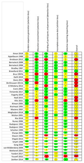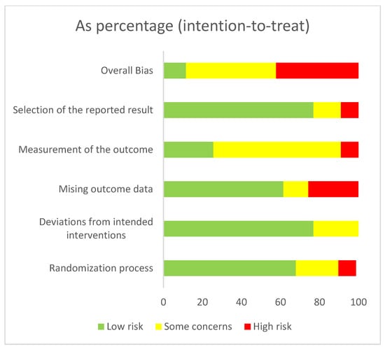 To assess the methodological quality of the included studies, the Cochrane Risk of Bias (RoB 2) tool was used [56]. This tool consists of five domains: sequence generation; allocation concealment; blinding of participants and personnel; incomplete outcome data; and selective reporting. Each criterion was evaluated separately for per-protocol and intention-to-treat designs based strictly on the published material and classified as either a having low risk of bias, some concerns, or a high risk of bias. Lastly, the domain bias ratings determined the overall risk of bias. There were some concerns about 51 studies (87%). Regarding the per-protocol studies, most concerns arose from randomized sequence generation (k = 26; 70%) or allocation concealment (k = 24; 65%). All in all, in ten studies (27%), there was a high risk of bias, while only one study (3%) had a low risk of bias. As for the intention-to-treat studies, incomplete outcome data (k = 13; 59%) and blinding (k = 8; 36%) were the signaling domains with the most concerns. Altogether, eight studies (36%), had a high risk of bias, while four had a low risk of bias (18%). Details of the risk of bias assessment are summarized in Figure 2, Figure 3, Figure 4 and Figure 5.