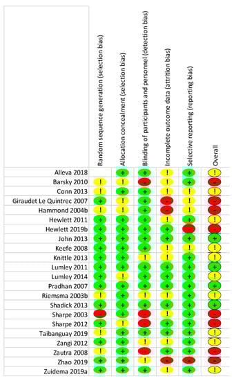 Risk of bias summary (intention-to-treat): a review of authors’ judgements about each risk of bias item for each included study. In these traffic light plots green indicates low risk of bias, while yellow indicates some concerns and red indicates high risk of bias.
