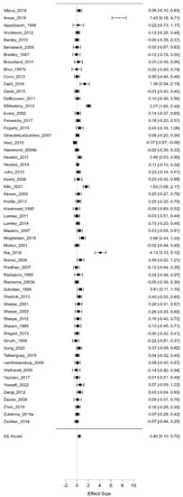 As can be observed from the aggregated results, the average value of Hedges-g (Hedges-g = 0.399, Z = 0.399, p = 0.009) yielded a significant medium effect size, suggesting that, on average, psychological interventions are moderately effective. Moreover, the maximum value of Hedges-g (Hedges-g = 0.856, Z = 4.223, p < 0.001) yielded a large effect size, demonstrating that, in the best case, these psychological interventions can even be highly effective. On the other hand, the minimum value of Hedges-g (Hedges-g = −0.047, Z = −0.335, p = 0.738) and the effect sizes calculated for the different types of psychological interventions did not differ significantly from 0. Notably, this latter finding indicates that, while there is no evidence for the efficacy of psychological interventions under all circumstances, there are also no cases with significant adverse outcomes. Furthermore, comparing the average minimum and maximum values of Hedges-g presented in Figure 6, Figure 7 and Figure 8, it can be concluded that psychological interventions are the most effective. Table 1 shows the different effect sizes for all psychological interventions.