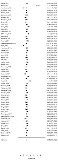 The statistical meta-analysis resulted in an overall maximum value of Hedges-g (Hedges-g = 0.856, Z = 4.223, p < 0.001), showing a significant effect size, and an overall average value of Hedges-g (Hedges-g = 0.399, Z = 0.399, p = 0.009), showing a medium effect size. These results further prove the psychological treatment of RA. Meanwhile, the overall minimum value of Hedges-g (Hedges-g = −0.047, Z = −0.335, p = 0.738) was insignificant, showing that psychological interventions in RA can be applied safely without adverse effects. Even in the worst case, the effect value was approximately 0, meaning that these methods are ineffective. On this basis, we can assume that, according to the studies in our meta-analysis, psychological interventions do not have any adverse effects. However, in the best case, these interventions can be highly effective. Moreover, these methods at least have moderate effects, even in average cases. All these results confirm previous findings that psychological interventions are essential in treating RA [21,23]. Based on the studies in this systematic review, we can confirm that psychological interventions positively affect RA patients, so their use is recommended.