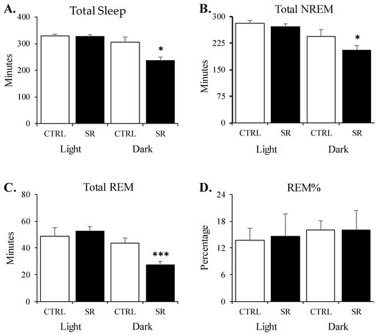 There were significant Group × time interactions for the hourly total NREM: F(19,532) = 2.831, p = 0.03, and for the hourly total REM: F(19,532) = 3.941, p = 0.015. Significant differences between the CTRL and SR rats for both NREM (Figure 6B) and REM (Figure 6C) were observed only during the dark period.