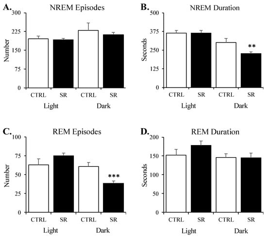 Selected sleep parameters for NREM and REM in control (CTRL) and irradiated (SR) rats during the 8 h light period and 12 h dark period. (A) nonrapid eye movement (NREM) episode number; (B) NREM episode duration; (C) rapid eye movement (REM) episode number; (D) REM episode duration. **, p < 0.01; ***, p < 0.001 for comparisons between CTRL (n = 15) and SR (n = 15). Data are presented as mean ± SEM.