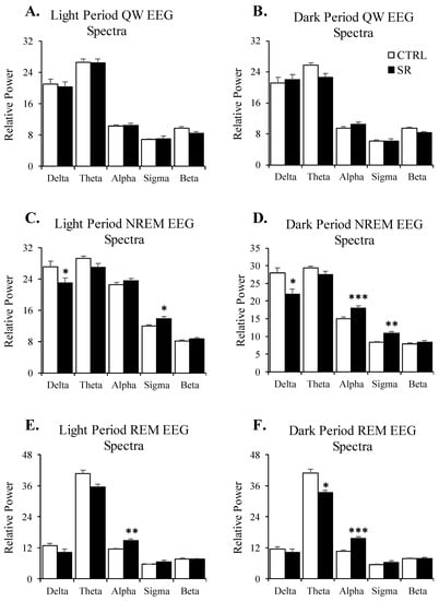 We examined the relative power of five spectral bands: delta, 0.5–4 Hz; theta, 4–8 Hz; alpha, 8–12 Hz; sigma, 12–16 Hz; beta, 16–24 Hz. The SR rats showed significant decreases in NREM delta power (light and dark periods) and significant increases in sigma (light and dark periods), and increases in alpha (dark period) power. NREM-associated EEG delta activity is considered a measure of potential changes in sleep intensity [,,]. Additionally, the SR rats also showed increased alpha band power during light and dark period REM. While the significance of these increases in the higher frequency bands is not fully understood, studies have suggested that increased spectral power in high-frequency bands in an EEG may be a hyperarousal marker of insomnia [,]. Lower NREM delta and greater alpha, sigma, and beta EEG activity have also been reported in patients with subjective, but not objective, insomnia []. Thus, reductions in delta and increases in the higher frequency bands suggest altered and potentially less restorative sleep after SR exposure.
