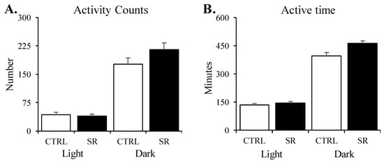 No significant differences were found between the CTRL and SR rats for activity, considered as either total activity counts (Figure 4A) or active time (Figure 4B) regarding the 8 h light or 12 h dark periods.