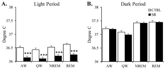 Core body temperature (CBT) plotted for active waking (AW), quiet waking (QW), nonrapid eye movement sleep (NREM), and rapid eye movement sleep (REM) in the control (CTRL) and irradiated (SR) rats during the 8 h light period and 12 h dark period. (A) CBT in the light period; (B) CBT in the dark period. ***, p < 0.001 for comparisons between CTRL (n = 15) and SR (n = 15). Data are presented as mean ± SEM.