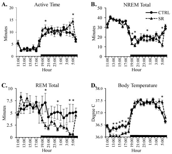 Hourly plots of select parameters in the control (CTRL) and irradiated (SR) rats. (A) active time; (B) nonrapid eye movement sleep (NREM); (C) rapid eye movement sleep (REM), and (D) core body temperature. *, p < 0.05 for comparisons of CTRL (n = 15) and SR (n = 15). Dark bar indicates dark period. Data are presented as mean ± SEM.