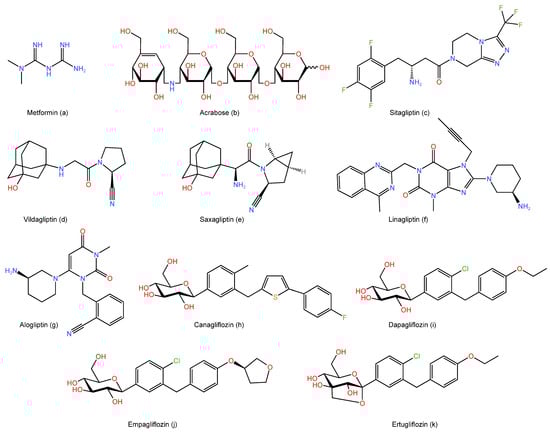 The chemical structures of: (a) Metformin, (b) Acarbose, (c) Sitagliptin, (d) Vildagliptin, (e) Saxagliptin, (f) Linagliptin, (g) Alogliptin, (h) Canagliflozin, (i) Dapagliflozin, (j) Empagliflozin, and (k) Ertugliflozin.