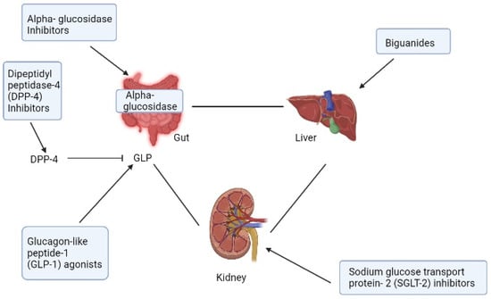 The primary mechanism of action of the biguanide, alpha-glucosidase inhibitors, dipeptidyl peptidase-4 (DPP-4) inhibitors, sodium-dependent glucose cotransporter proteins-2 (SGLT-2) inhibitors, and glucagon-like peptide-1 (GLP-1) agonists.