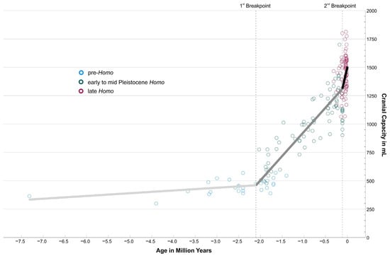It is safe to assume that the forerunners of humans were subject to the same evolutionary forces as all other living beings for millions of years. This leans on the ideas that Darwin and many others developed and described over the last 200 years, and which we can find in the textbooks. In an analogy in modern language usage, we could call it “Evolution 1.0”. This means basically that random changes in the genome (e.g., through mutation and recombination) and natural selection are main factors in triggering adaptations of populations to changing environments. Additional random factors such as gene drift, founder effects, and others affect the fate of a population. The overproduction of individuals and their diversity are the substrate for selection, which implies unequal reproduction among members. In this regard, the very first hominins and the successive Australopithecines during the Late Miocene and the Pliocene were just as exposed to these natural forces as the famous Darwin finches on the Galapagos Islands, and probably also the earliest representatives of our Homo lineage, which tentatively emerged between 2.8 and 2.5 million years ago [27]. Fossil remains and artefacts are notoriously sparse at the transition from Australopithecines to Homo, and dating issues leave us with further uncertainties. Simple stone tools were already in use in several African locations in those times, and they were not necessarily associated with the genus Homo [28]. The Lomekwian and Oldowan industries between 3.3 and 1.7 million years ago are the first preserved evidences of this tool technology. Those tools were usually made by chipping off one flake, or a few flakes, of stone with another stone, but show no greater sophistication. Their production is straightforward and can be quickly acquired [29]. These tools appear hundreds of thousands of years before any evidence of brain expansion [30]. Tools were becoming more frequent and widespread approximately two million years ago when brain and body size showed evidence of increase [31]. This also fits the first breakpoint found in the present analysis of cranial capacity (Figure 1).
