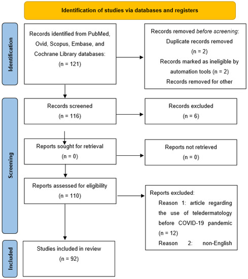 A total of 121 records were identified from the analyzed databases (PubMed, Ovid, Scopus, Embase, MEDLINE, Google Scholar, and Cochrane Library databases). However, only 110 articles were assessed for eligibility, since duplicate manuscripts and ineligible articles were excluded. Finally, 92 articles were selected at the end of the literature research for our review, excluding manuscripts that did not meet our inclusion and exclusion criteria. In particular, we focused our attention on four chronic inflammatory cutaneous disorders that during the pandemic could not be abandoned by dermatologists precisely because of the chronic nature of the diseases, as they required continuous follow-up visits to assess disease severity and to allow for therapeutic continuity [16,17,18]. Moreover, these pathologies were also evaluated due to their high prevalence in the general population. The diseases researched were acne, psoriasis, atopic dermatitis, and hidradenitis suppurativa.