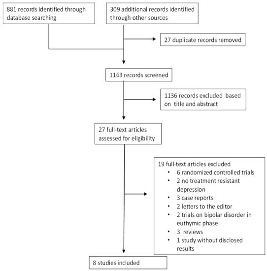 The literature search generated 881 records and another 309 records were identified from trial registers. After duplicate removal through EndNote, 1163 titles and abstracts were initially assessed; 1136 articles were excluded from the title and abstract, and 27 articles were retrieved in full text. Nineteen studies were excluded for the following reasons, three were RCTs including patients without TRD [64,65,66], three were RCTs [67,68,69], two included patients without TRD [70,71], three were case reports [72,73,74], two were letters to the editor [54,75], two were trials conducted on individuals with bipolar disorder in the euthymic phase [76,77], three were reviews [31,58,78], and one was a clinical trial on individuals with bipolar disorder treated with quetiapine extended-release and pramipexole, but the results were not disclosed [79] (see flow chart, Figure 1).