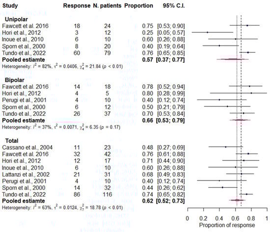 Forest plot with the total pooled estimates of treatment response and by diagnosis. Cassano et al., 2004 [80]; Fawcett et al., 2016 [85]; Hori et al., 2012 [49]; Inoue et al., 2010 [81]; Lattanzi et al., 2002 [82]; Perugi et al., 2001 [83]; Sporn et al., 2000 [84]; Tundo et al., 2022 [86].