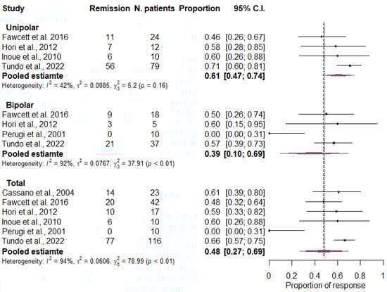 Forest plot showing the total pooled estimates of remission and by diagnosis. Cassano et al., 2004 [80]; Fawcett et al., 2016 [85]; Hori et al., 2012 [49]; Inoue et al., 2010 [81]; Perugi et al., 2001 [83]; Tundo et al., 2022 [86].