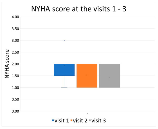 The first follow-up visit (via telephone for three patients) was scheduled three months following hospital discharge. Four patients reported no dyspnea (NYHA 1), 10 had mild exertional dyspnea (NYHA 2), and 3 had severe exertional dyspnea (NYHA 3). None had dyspnea at rest. The mean NYHA score was 1.94 at the initial examination. All patients had at least partially improved their exercise tolerance by follow-up. During the check-up after three months, NYHA 1 and 2 was reported in 9 and 7 patients, respectively, with one patient reporting NYHA 3. The mean NYHA score after three months of follow-up was 1.53. Further improvement was observed after one year, when ten patients reported NYHA 1 and 7 reported NYHA 2, with a mean NYHA score of 1.41. The development of NYHA score is displayed in Figure 1.
